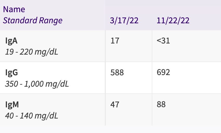 As you can see, IgG and IgM were normal. But we still need to get a value for our most recent IgA level, as it was reported as <31 (which isn't helpful). We need to clarify this, as selective IgA deficiency is associated with autoimmune disease and antibody production.